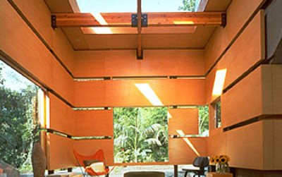 The O'Neil guesthouse is 800 square feet in area and consists of two major elements- a bedroom and a living room seperated by an earthen stair. Similar to a bunker, the bedroom is partially buried in the ground and has a suspended roof form in the shape of a boat, planted with wild grass. The living room is copper sheeted on the exterior with maple panels on the interior, reminiscent of an old crate. Strips of glass seperate each panel to further accentuate the design and to break down the scale. The earthen stair connects the upper pool deck and the lower garden and allows the landscape to 'join' the rooms together. The dining table is set beneath the stair, while behind all three forms and underneath the pool deck are located the kitchen, bathroo, and service areas which connect the rooms. The roof of this area is level with the pool and constructed from broken concrete set in sod, bringing the lower gaden up to the pool deck.